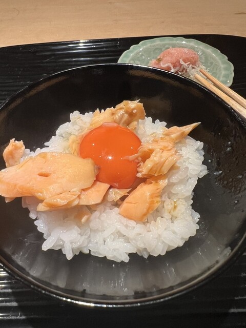 鮭ごはんで卵黄のせです。鮭の塩加減と卵黄のまろやかさ、醤油の加減でやっぱりペロリでした。