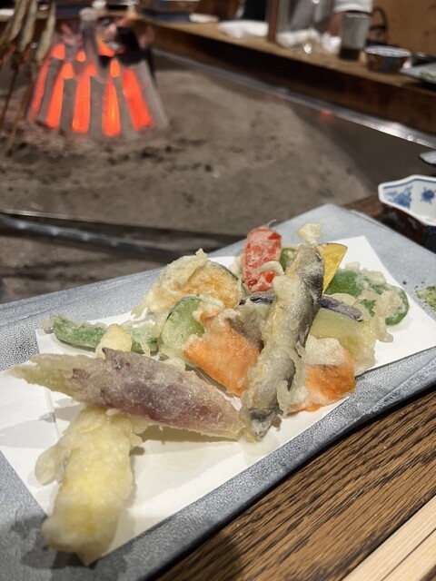 次は稚鮎と野菜の天ぷらです。野菜はいずれも近隣から入荷したものだそうです。パプリカとピーマンが驚くほど甘く美味しかったです。