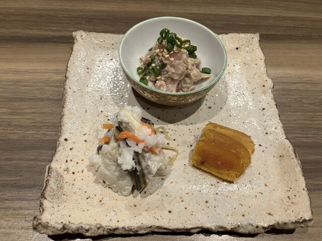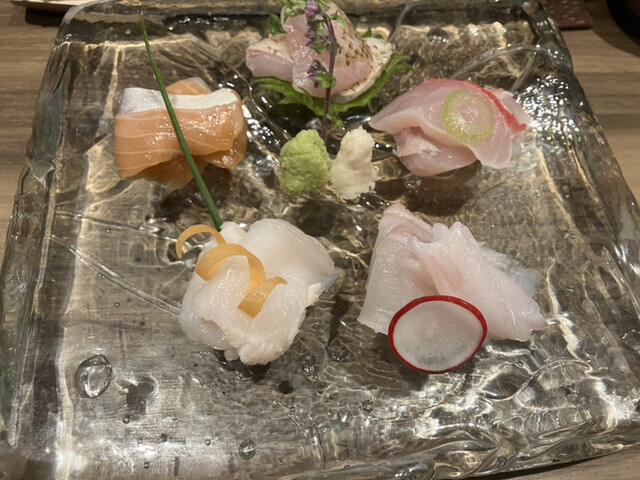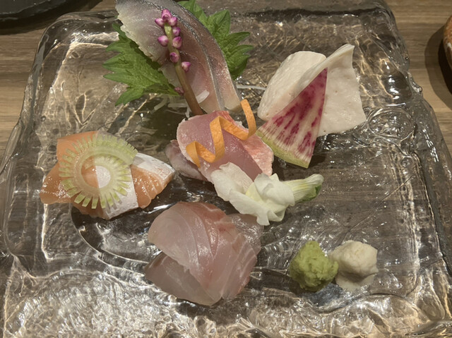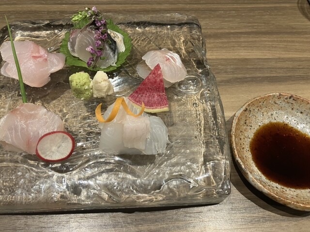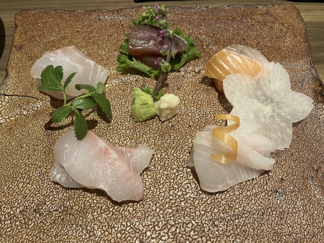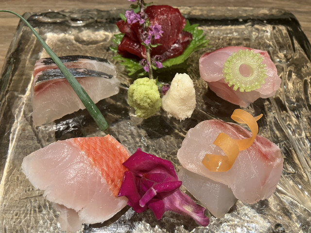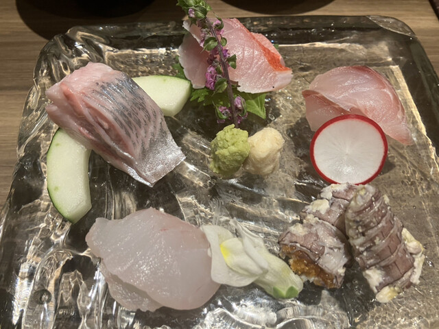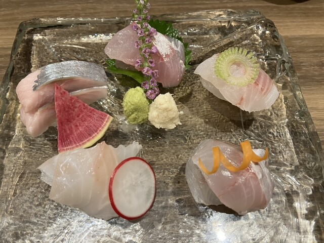 自家製シメサバ、キアラ、サメガレイ、イサキ、コチのお造り