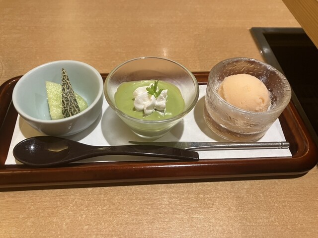 野菜ジュースのソルベ、抹茶ムース、メロン