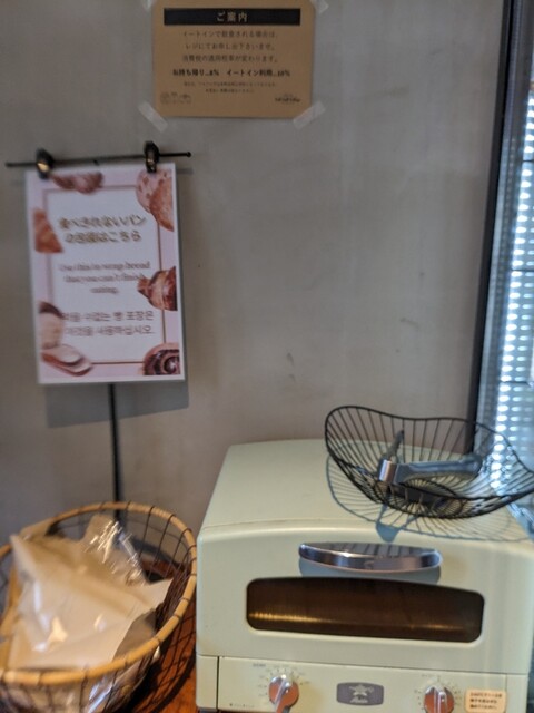 イートインの為にリベイク用のアラジンのトースターや食べきれないパンの持ち帰り用の包装紙などが用意してあります