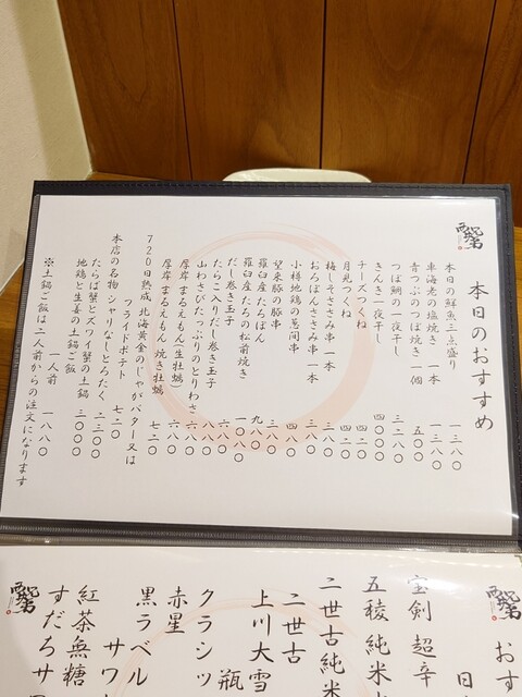 串類は長芋、なす、トマト、しいたけ、ねぎ、ししとう、小樽地鶏の手羽先、もも、胸、つくねを注文。目の前の厨房で丁寧に焼き上げた塩加減抜群、素材の旨みを活かした串は絶品です。