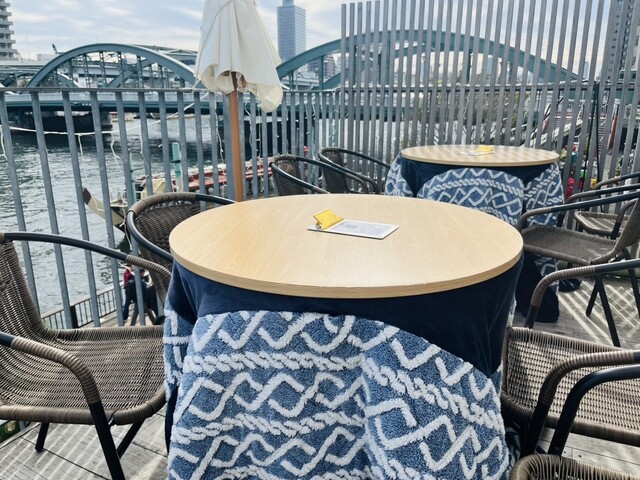 酉の市に行く前に主人と娘とランチに選んだこちらのお店は、テラス席から見る隅田川の景観が素晴らしいイタリアンカフェです。少し肌寒い日の昼間、もしテラス席では寒かったら中で食事をしようと11:30に予約して初めて伺いました。テラス席にはこたつがあり、寒かったら半纏も貸して下さるというのでテラス席を希望。テーブル席に設置されたこたつが暖かく、半纏はいらないほど快適でした。テラス席は+550円掛かりますが、静かな河沿いのテラスでスカイツリーを臨みながら、川を行き交う隅田川クルーズの船が何とも情緒のある素敵な空間での食事に大満足。スタッフの方もとても親切で居心地の良いレストランです。