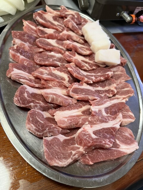 ラム肉に牛脂が4個、ジンギスカンのタレと辛味噌がセットになってます。