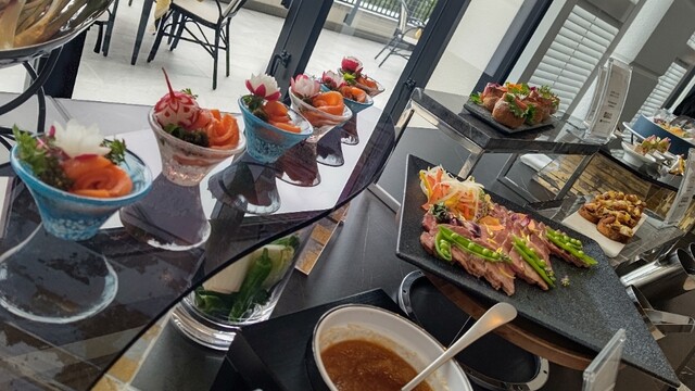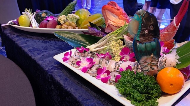 沖縄県産の鮪、車海老、マクブ、夜光貝、海ぶどうの盛り合わせ
