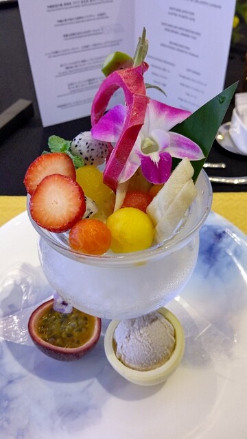 県産季節のフルーツ 生パッションフルーツとさんぴん花茶アイスクリーム Okinawan sourced seasonal fruits, fresh passion fruit and sanpin-cha ice cream.