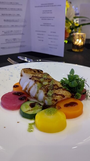 赤仁ミーバイのポワレ県産ハーブとバジルのペースト、 2種の島人参とズッキーニとバルサミコソース