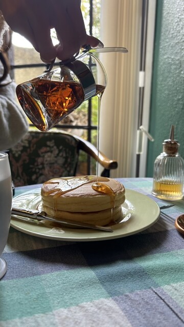 ホットケーキは家では作れない厚焼きのフォルム、添えられたシロップとバターがよく染み込んでとても美味しかったです