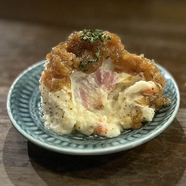 安定にポテトサラダも注文!シャリアピンソースで味付けがされていて、中にはゴロッとベーコンが!そして驚いたのが地鶏のカルパッチョ。まさかのあてまきスタイル!!こんなカルパッチョ見たことない、、、。見た目もよくて味も一級品ですね〜。