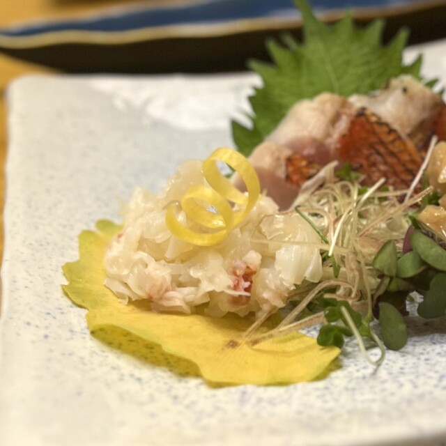 次に来たのはお刺身盛り合わせ!なんと伊勢海老刺身とカワハギの肝和えと金目鯛の炭炙り!!本当にどれも美味しかったのですがカワハギの肝和えが他で味わったことのないような独特の味でとてもお酒との相性が良かったです!日本酒が◎