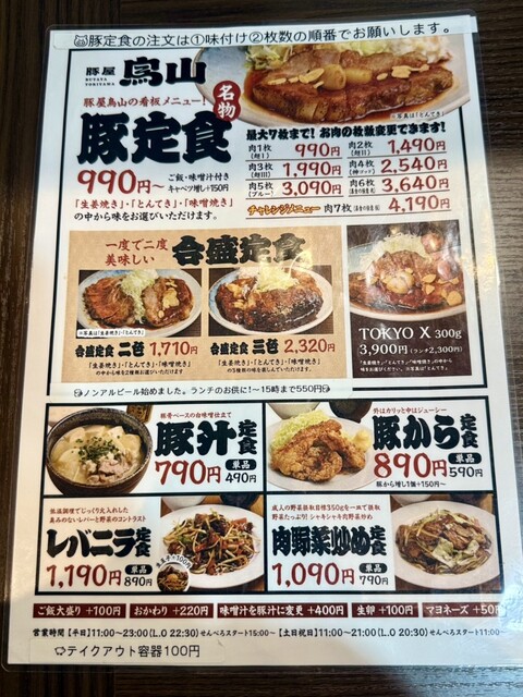 - 「生姜焼き」「とんてき」「味噌焼き」から味を選択可能。