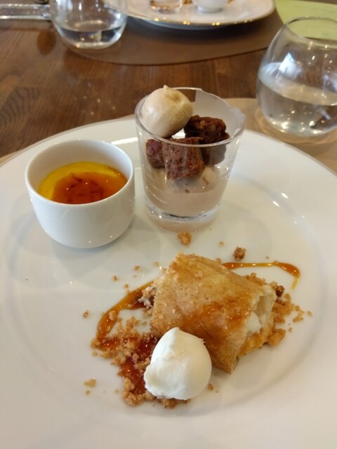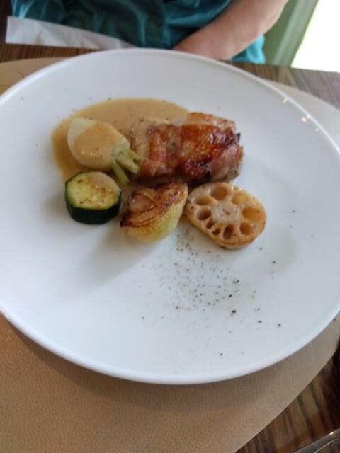 綺麗に頂きました。冬瓜の冷製スープ、中にゼリーの粉砕されたのが、入っていて、のどごしが良かったです。豚のパテは濃厚な香り高いソ―スを絡めて頂きました。デザートはマンゴームースとマンゴーアイス。