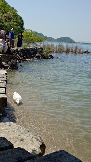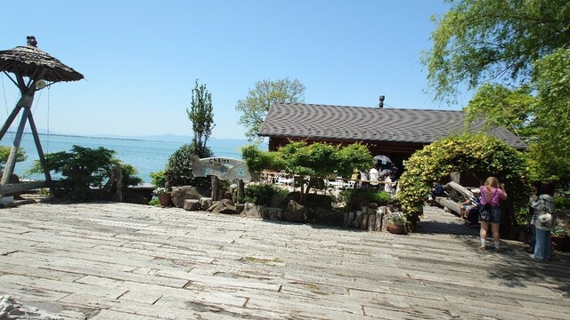 カフェ入口の左にて琵琶湖の海岸沿いまで降りれるスポットがあり、アヒルと戯れることができます。