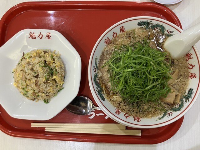 背脂豚骨醤油ラーメンに九条ネギをトッピング、半チャーハンのセットを注文。