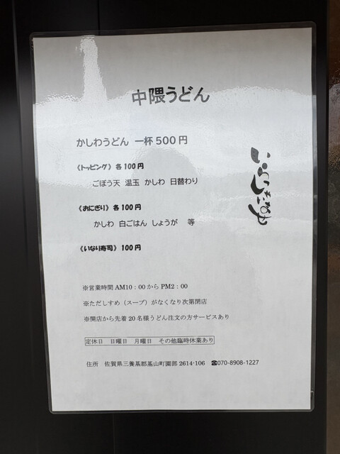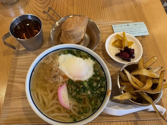 かしわうどん500円、いなり100円、温玉100円、ごぼう天サービス