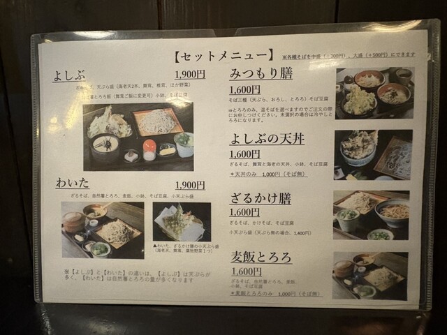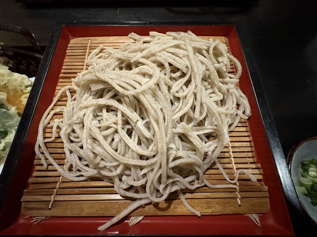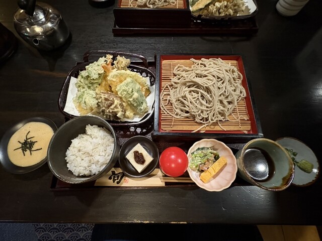 ざるそば、天ぷら盛(海老天2本、舞茸、椎茸、ほか野菜)、自然薯とろろ飯