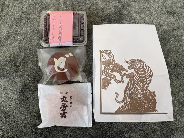 福岡県久留米市、JR久留米駅西側にある和菓子処とらやにて、丸芳露76円、どら焼き162円、おはぎ2個入238円