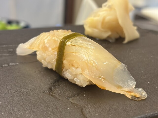 ▶︎磯貝の風味豊かな香り。色は赤みが強めで鮮度の良さがうかがえました。飾り切りによってコリコリとした食感がより楽しめました。
