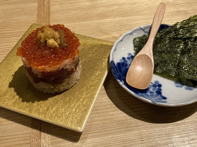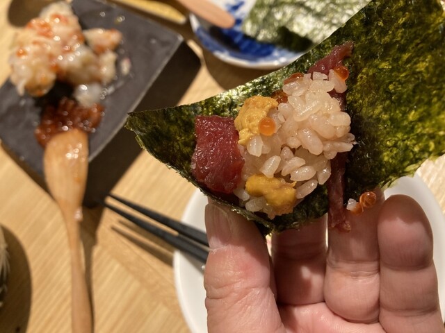 昔話で聞いたことある響きだか、このお店では名物メニューだぞ。数量限定のようなのであればラッキー。蟹の甲羅に海老と蟹とうずらの黄身といくらまで乗った豪華な内容。細巻きに乗せて食べるぞ。贅沢感この上なく、美味しかった。