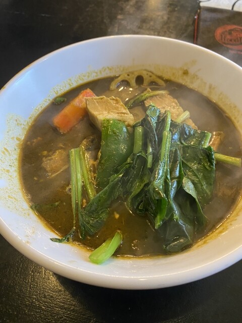 狙い通り待ちなく着席。メニューをきめるときにテンパってしまい前回と同じ豚角煮とほうれん草のサグカレーを。でも今回は行者トリ団子をトッピング。結果的にこれが大正解!!濃厚な行者ニンニクの香りは最高でした。北海道の春の味ですね。