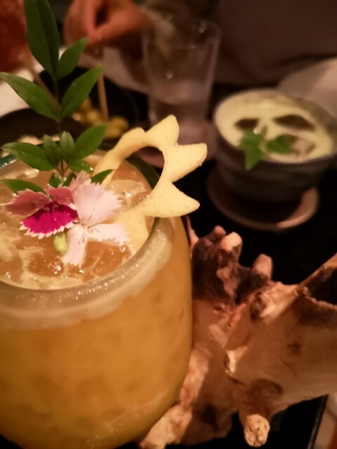 シーズンオススメカクテルから、映えそうな流木セッティングの夏向きカクテルをチョイス。友達は抹茶ベースのモクテル。