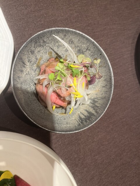 白レバーの最中・フルーツトマトのサラダ・中山牛のローストビーフと茄子・牛肉のブレゼ・メジナのカルパッチョ・タカノハダイの炙り、春菊のソース・ハニーローストポーク・ウフブルイエ・海老のクロケット・タコのバターライス・べにはるかのポタージュ