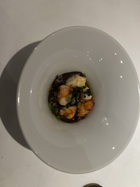 ・蝦夷鮑(白ワインで5hr蒸し)、そでいか、芽キャベツ、肝のソース