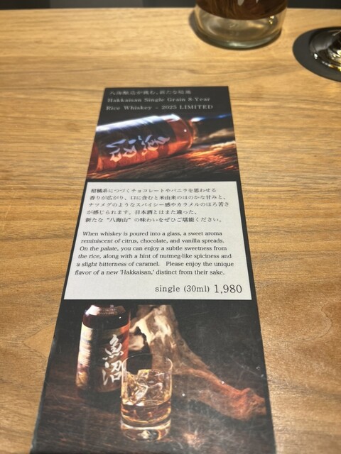 現地の植物(レモンは除く)で作った山野草酒に興味をひかれ、フキノトウとクロモジをロックで注文。自然の滋味を感じられる大人な味です。また八海醸造が作っているウィスキーがあり、抽選で当たらないと購入できないようです。限定物に目がないので、こちらも注文。ストレートで香りや味を楽しまさせて貰いました。