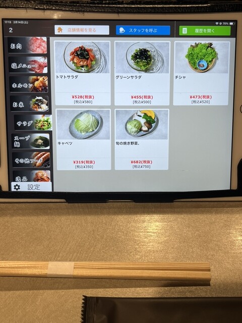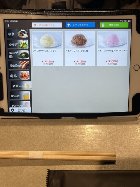 iPadでの注文でメニュー一つ一つが画像で出されていて左側にサイドメニューやご飯メニューを選択することができ、とても分かりやすくてよかったです!(iPadケースの角度もいい感じ!)