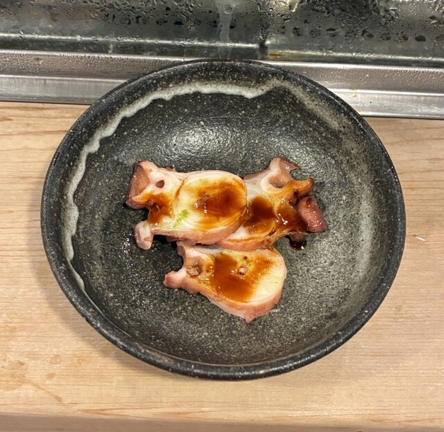 大将が出してくれる数々の料理は大きく分けると2部構成で、おつまみパートから入り、後半は握り。さて第1部おつまみパートは、もずくから始まり、お刺身、いかの塩辛、たこ、鯨と続く。刺身は流石にネタが別格にうまい。塩辛も、すだちかな?ほんのり柑橘が香ってくる。