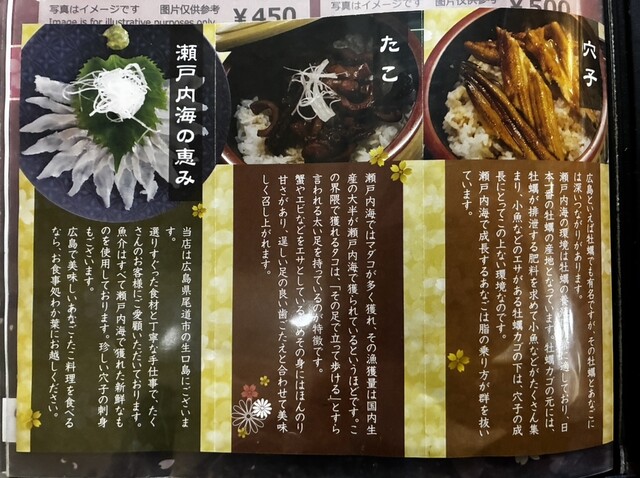 しまなみ海道から生口島に入り、島の西側の港近くの商店街にある海鮮料理屋。メニューを見ると、刺身や寿司などもあるが、天丼に惹かれて得盛天丼のごはん多めを注文。さらに事前に注文しておいたレモン鍋をいただいた。