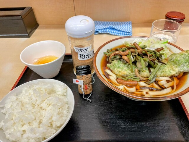 なんと言っても鰹節の出汁がウリのお店なので、別に蕎麦にこだわる必要はないと考えて、うどんを頂きました。18:30の時点で天ぷらはほぼ完売。辛うじて残っていたちくわ天と生卵を山菜うどんにトッピング。