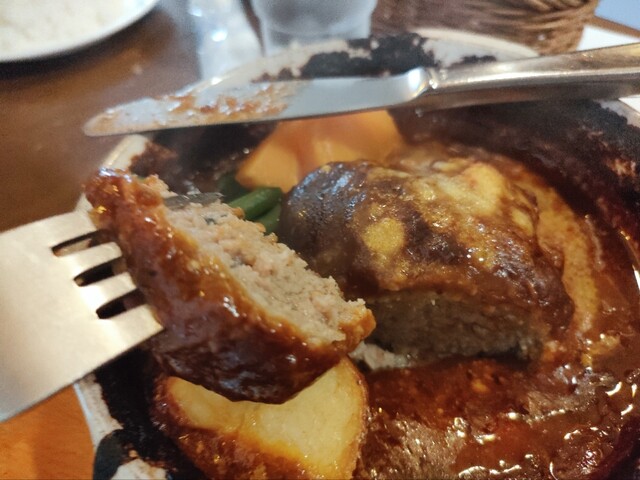 ハンバーグ、柔らかで弾力もあります。150gですが、充分な食べごたえです。ソースでお皿ごと煮込んでるのかな、チョット焦げたところも有って香ばしさも感じられます。付合せの野菜もソースと良く会います。コックさんありがとうございますって言いたくなるレベル。むちゃうまハンバーグ。