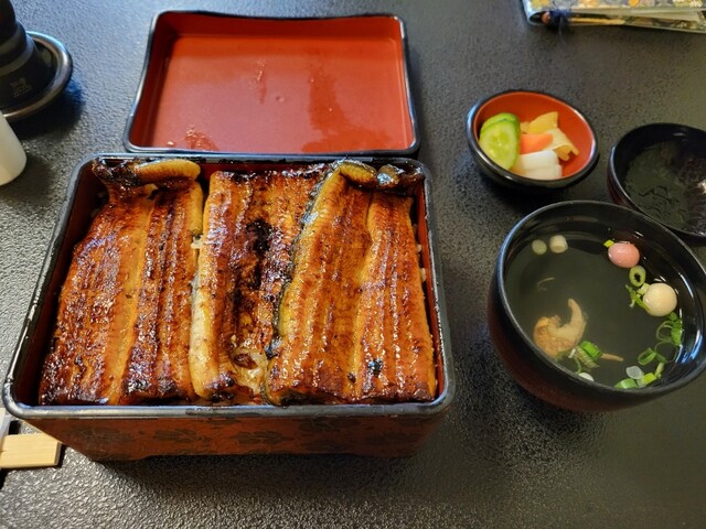 見た目、かなりのボリューム!特上なので、1尾半なのだが、お重に入りきれなくて大分重なっている(笑)