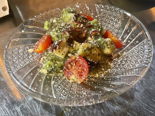 蛸とアボカドのバジルソース 女子が好きそうでお酒のアテにはいい感じ