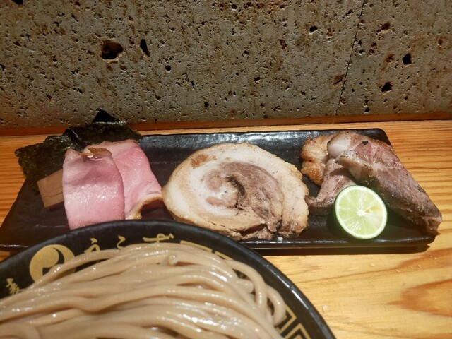 山梨県でしかとれないポークを3種の方法で調理しています。とくにステーキが感動的でした。脂身と赤身のバランスがよく、つけ汁につけずにいただいてもおいしかったです。結構ボリュームがあるので、麺大盛りにしたならハーフでもよかったなと思いました。