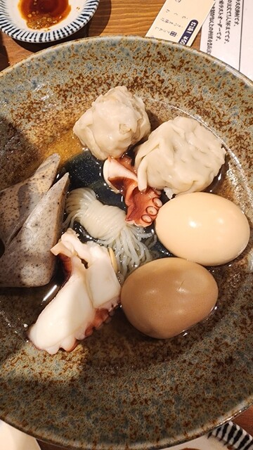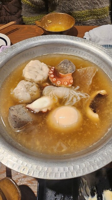 今回は、2名で、コース料理を注文しましたが、早い時間だったので、タコ足を何回も頼んで、また、たまごも、充分に、煮えてました。生ビールもギンギンに冷えて美味しかったです。お試しコース頼んでも、おでんが食べ放題なので、お財布にもやさしい感じです。今回は、今年の運を使い果たしたか?食べログスクラッチで2等が当選したので、有りがたく利用させて頂きました(笑)