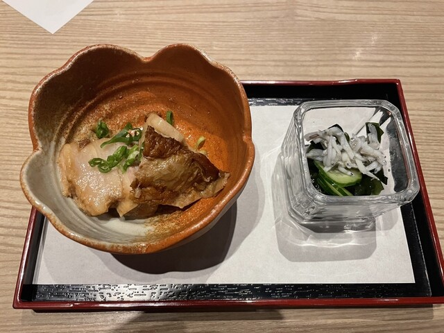 お腹があまり空いていなかったので、お通し(豚の角煮と酢物)、サラダ、ブリヒラのお刺身、ミニ海鮮丼を2人でシェア。