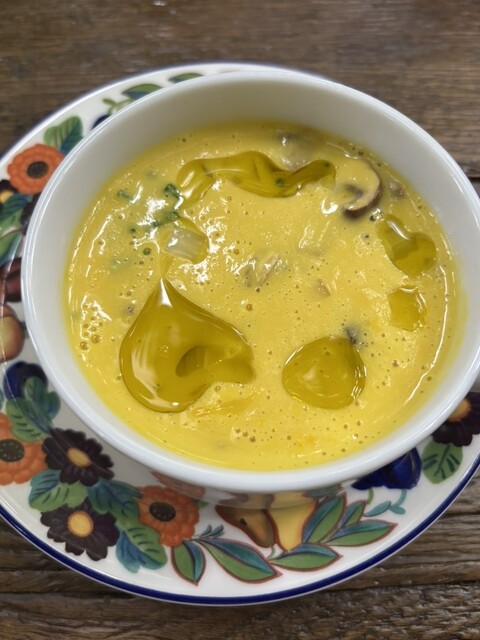 ミニスープが300円であったので頼んだらカボチャのポタージュスープと聞いたので具が無いスープを想像していたらビックリ‼️中に野菜がたくさん入ったポタージュスープでした。なかなかポタージュスープで具がたくさん入っているスープは、飲んだことがなかったので想像を遥かに超えたスープでした。クリーミーでカボチャが重くなくて美味しかった。