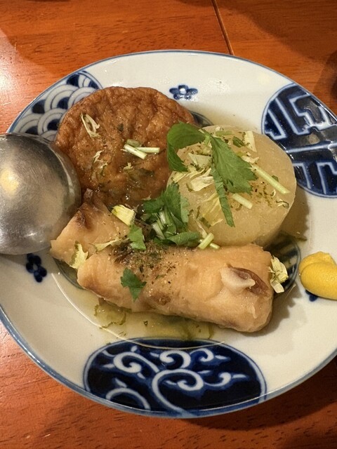 冬はおでんが並び暖まる。個人的にはごぼう揚げ(サイズ選べる)、唐揚げ、ピーマンが非常にお酒の進む良いお味で中々に箸が止まらなくてお気に入り。地酒も東北色々なところのものが選べるので楽しい。飲み放題はないので飲む量は程々がいいかも。