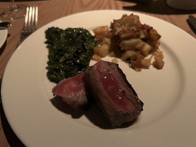 Tボーンステーキはアメリカだなっ感じで私は大好き。フィレもサーロインも熱々でバターかけて食べると本当に幸せ。付け合わせのCreamed spinachもよし。