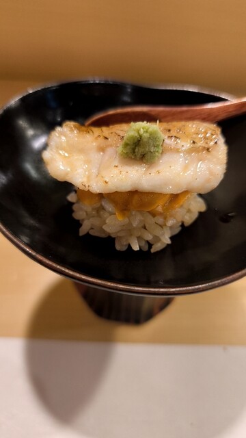 のどぐろの小丼はシャリとの間にウニ、ほぐして食べます。最高のハーモニーで感動のひと言。