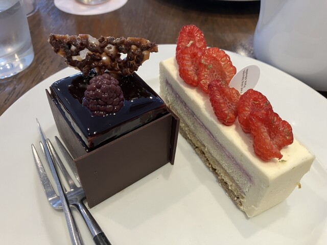 ジベルニーはライム風味のホワイトチョコレートにフランボワーズのソース、ピスタチオのババロアを包んであるそうです。ルシュープレームは、ブラックベリー風味のチョコレートムースとブラックベリーティーのクリーム、チョコレートのスポンジを重ねたケーキだそうです。