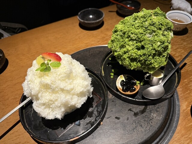 デザートはかき氷で2種類を4人でシェアしました。抹茶とフルーツが入ったミルク氷で、抹茶は少し苦めだったのでミルクの方が好きでした。