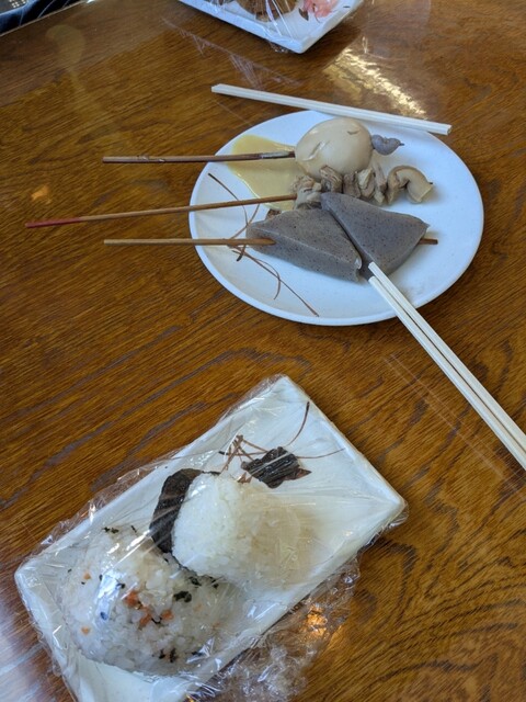 おにぎりはとっても大きくて、お皿に2つも入っていました。(これでお腹の容量が残り40%くらいに…)おでんは、お豆腐・こんにゃく・卵・牛すじ。