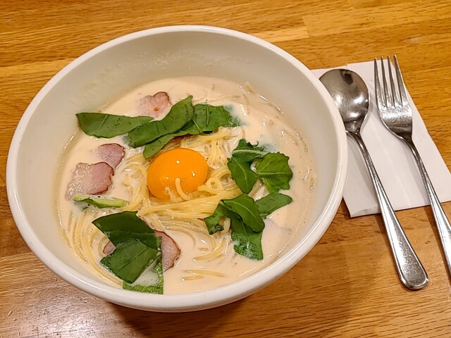 前回食べたレッドカルボナーラと迷ったけどカルボナーラ豆乳スープにしてみました。