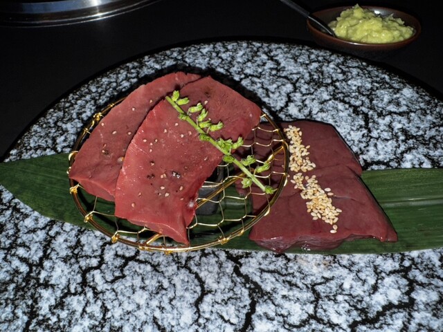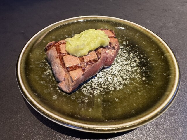 南青山の「煌 焼肉」でいただいた南青山コースは、肉そのものの質はもちろん、見せ方や食べさせ方に至るまで細部にこだわりが感じられた。まず最初に登場したのは黒毛和牛のレアローストビーフとタルタルミート。表面だけを丁寧に火入れし、中は鮮やかなピンク色に仕上げられていて、口に含むとしっとり柔らかく、赤身の旨みがじんわりと広がる。添えられた薬味やソースは控えめで、肉本来の甘みを引き立てており、前菜ながらしっかりと印象に残る一皿だった。