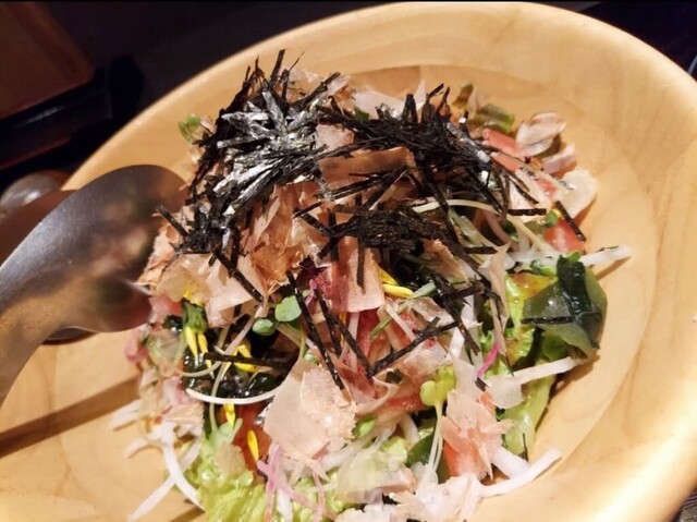 まず目を引いたのがサラダ。大きめの器に盛られた野菜の上には、海苔や鰹節がたっぷりとかかり、香りからして食欲を刺激してくる。ドレッシングは主張しすぎず、野菜の水分と合わさって自然にまとまる。最初の一皿として、口と気分を整えてくれる存在だ。