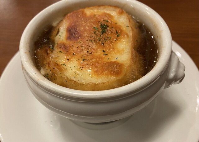 サラダの見た目もオシャレで、オニオングラタンスープも美味しい。