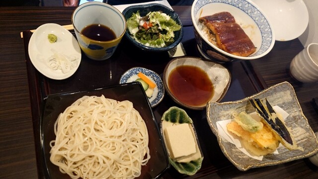 連れはまぐろと2とろのぶっかけ蕎麦、久の半ご膳、カレー丼を注文。